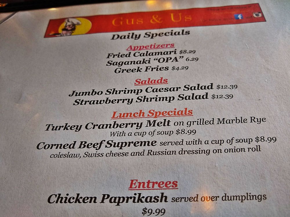Discover the ultimate dining experience at Gus & Us Grill, a Greek-American fusion restaurant located in Allen Park, MI. Offering a diverse menu featuring Greek specialties, burgers, and breakfast items, this establishment caters to a wide range of preferences. Standout dishes include the indulgent Cheese Sticks, the fiery Saganaki, and the crispy Chicken Tenders. Customers rave about the comforting Chicken Lemon Rice Soup, the hearty Club Sandwich Deluxe, and the savory Grilled Ham and Cheese Sandwich. The warm atmosphere, attentive service, and extensive amenities like outdoor seating, free Wi-Fi, and happy hour specials make Gus & Us Grill a must-visit destination. Whether you're a fan of Greek cuisine or classic American fare, this restaurant promises a memorable dining experience for food enthusiasts of all kinds.